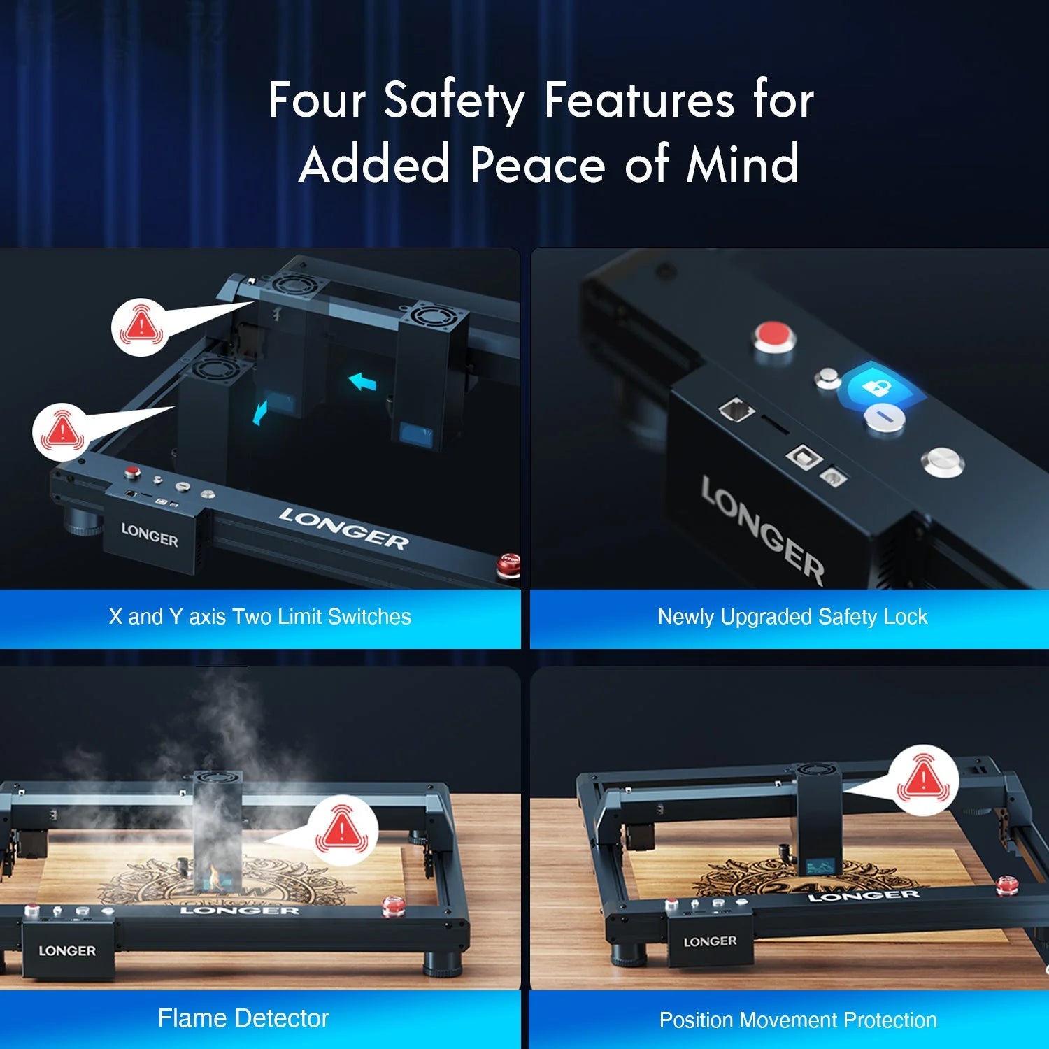 - Safety features: motion detection, overheating protection